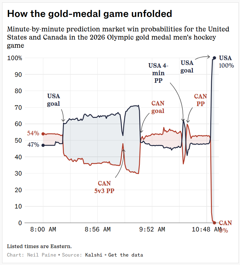 Even if the US fell short of its usual standards in a few sports these Winter Games, the medal table will only slightly reflect the title that was most important to the Americans at Milan: the golds they won in men’s and women’s hockey (over Canada in both cases). The men’s final was a particularly tense affair, and it’s fair to say Canada outplayed the US across the game as a whole, even as Team USA got the better of things in three-on-three overtime (a format Canadian coach Jon Cooper rightly criticized after the loss). But given the longstanding rivalry between these two teams, how could the game have ended any other way than on a golden goal in OT? Here’s how the prediction markets saw the gold medal contest playing out through the lens of win probability: