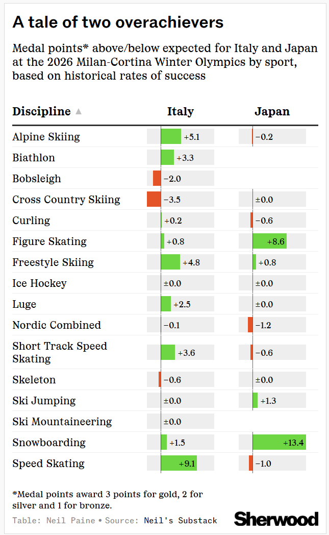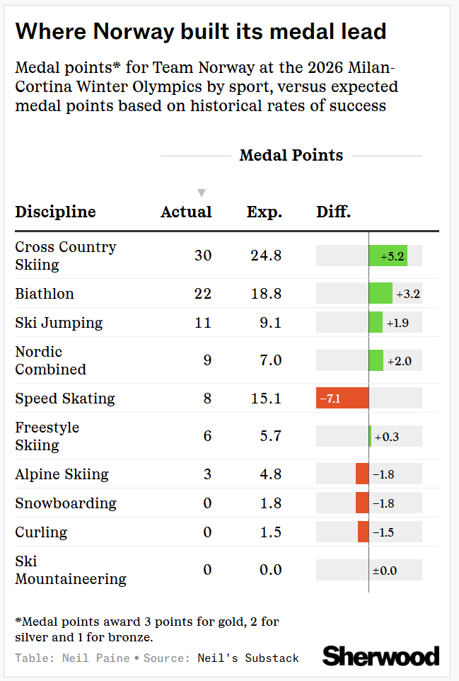 Here’s how their medal points at Milan Cortina broke down versus what we’d expect from their long-term historical averages in each sport: