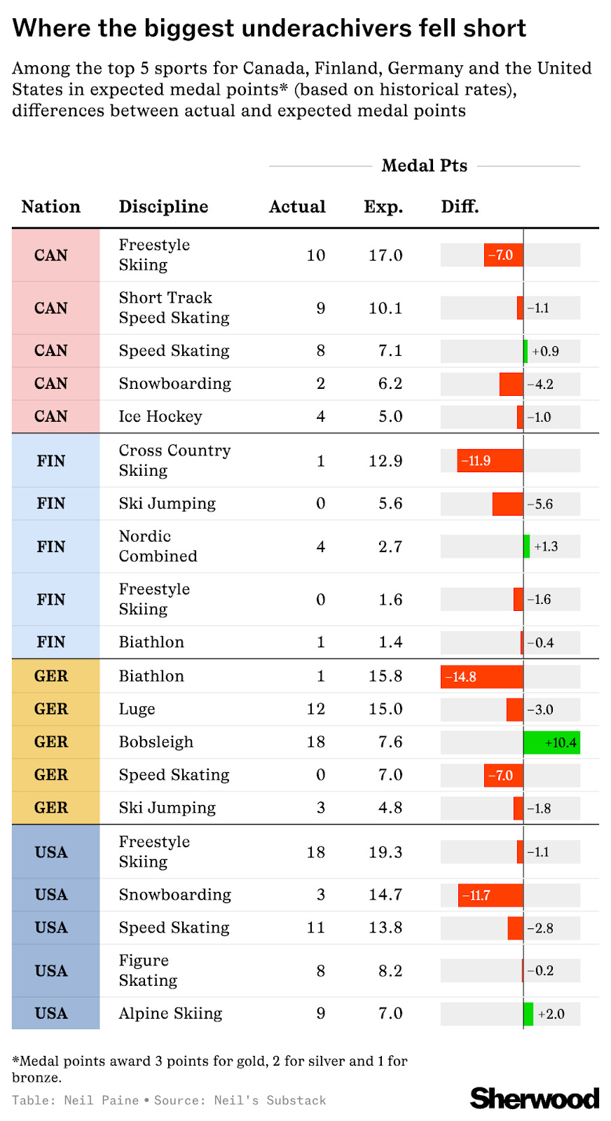 While hockey was the defeat that stung the most for Canada (see below), it was actually freestyle skiing and snowboarding where it most undershot medal expectations, while Finland was undone by cross-country skiing and ski jumping, Germany lost ground in the biathlon (hugely!) and speed skating, and the US dipped mainly in snowboarding with some speed skating tossed in as well — despite the star-making turn of Jordan Stolz.