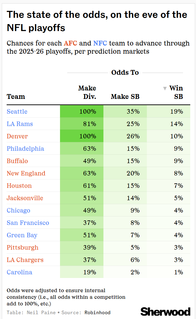 As the NFL playoffs are about to get underway, one big thing that stands out is just how deep the field of contenders is — without a true runaway favorite like we’ve seen in years past. According to the prediction markets, here are the odds for each playoff team to make a run this postseason:
