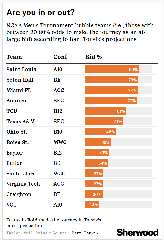 The period immediately after New Year’s Day is a natural reset of sorts for the college basketball seasons (men’s and women’s). For one thing, conference play tends to begin in earnest — but there’s also enough in each team’s resume to begin tracking the dreaded bubble, where a team’s fate in or out of the NCAA tournament hangs in the balance. Analyst Bart Torvik has a great tool for this, in which he estimates each team’s chance to be selected for the tourney as an at-large bid if they don’t win their conference. As of Monday, here are his odds for men’s hoops teams that are sitting between a 20% and 80% bid probability: