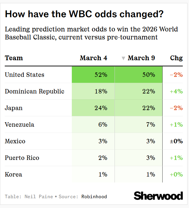 The first weekend of the World Baseball Classic is in the books (plus Monday morning’s Korea-Australia result), so it’s worth looking at how the odds have changed, as we are about two-thirds of the way through pool play — well into the sorting stage that will determine who makes the knockouts and what seeds they will carry. The biggest gainer in the odds was the Dominican Republic, which jumped 4 points (to 22%) after a dominant start in Pool D, pulling even with Japan for the second-best odds in the field. Conversely, Japan saw its title probability dip slightly despite already clinching Pool C; while their advancement is secure, the market likely reacted to the rising stock of their potential knockout-round opponents. Meanwhile, the US remains the heavy favorite to win at 50%, though their odds went down by 2% as their group is looking quite dangerous. The Americans go into the next few days’ matchups with Mexico and Italy technically trailing them in the Pool B standings.