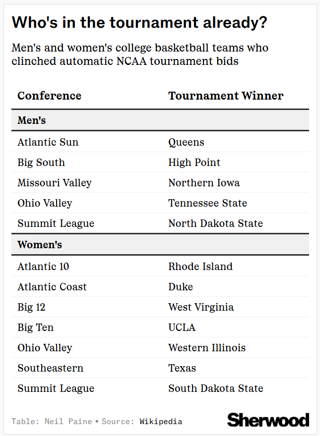 Sunday marked exactly one week to go until the NCAA selection show and the reveal of the men’s and women’s basketball brackets on March 15. But there’s still a lot of basketball between now and then — including the remaining conference tournaments, which are mostly wrapped for women’s power conferences but have mainly just involved small conferences on the men’s side so far. Here’s who has won to punch their tickets to The Big Dance as of Monday morning: