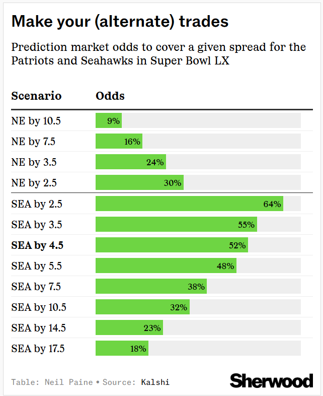 Against all of that, the Seahawks’ 4.5-point edge over the Patriots in this year’s odds is actually surprisingly large by recent standards. It’s the first time since the Pats and Eagles in 2018 that the spread was greater than 4 points, and it’s tied for the largest spread in a Super Bowl since the Steelers were favored by 6.5 over the Cardinals in Super Bowl XLIII. Of course, if you think that figure for Seattle is too high (or too low), you can trade on alternate spreads as well, looking for odds that might be more or less favorable than the main spread: