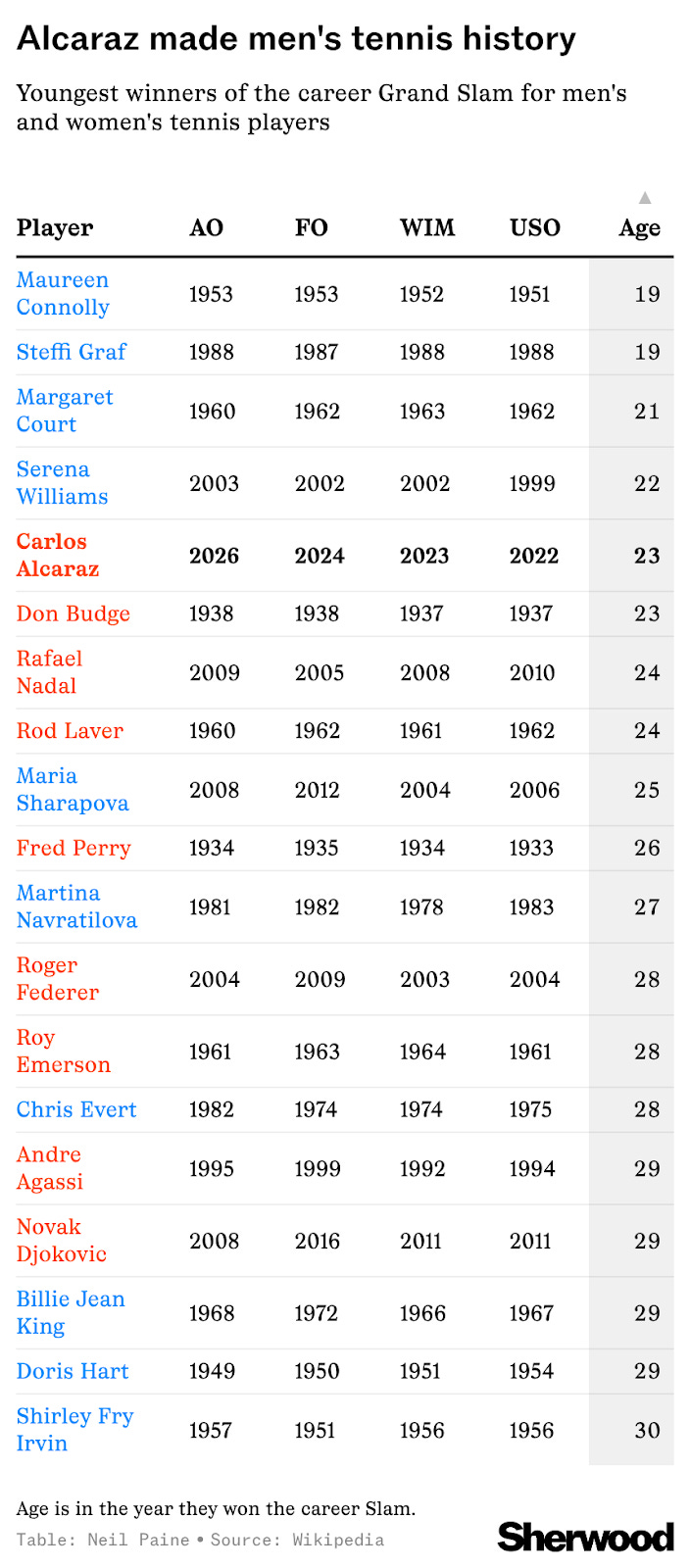Over the weekend, the Australian Open wrapped up with a pair of final matches that were well worth the wait. On the women’s side, underdog Elena Rybakina bore down late to hold off world No. 1 Aryna Sabalenka and secure her second career major title. And on the men’s side, Carlos Alcaraz overcame a first-set loss to defeat Novak Djokovic for his seventh career major, joining a club that contains John McEnroe and others. Even more notably, Alcaraz’s Aussie Open win secured him the coveted Career Grand Slam, as he had previously won each of the French and US Opens and Wimbledon. With that, he became the youngest men’s player ever to capture all four Slam titles in his career. Here’s a look at the youngest Career Slam winners for men and women, based on the age they were during the year they capped off the accomplishment: