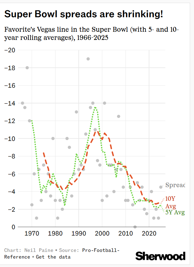 Beyond that, 16 of the 17 Super Bowls since 2008 have had a spread of 5 points or less, and 11 of 17 have been set at 3 points or less. The average Super Bowl favorite’s edge in the 2020s is just 2.4 points, compared with 3.2 in the 2010s, 7.1 in the 2000s, and a whopping 10.9 in the 1990s!