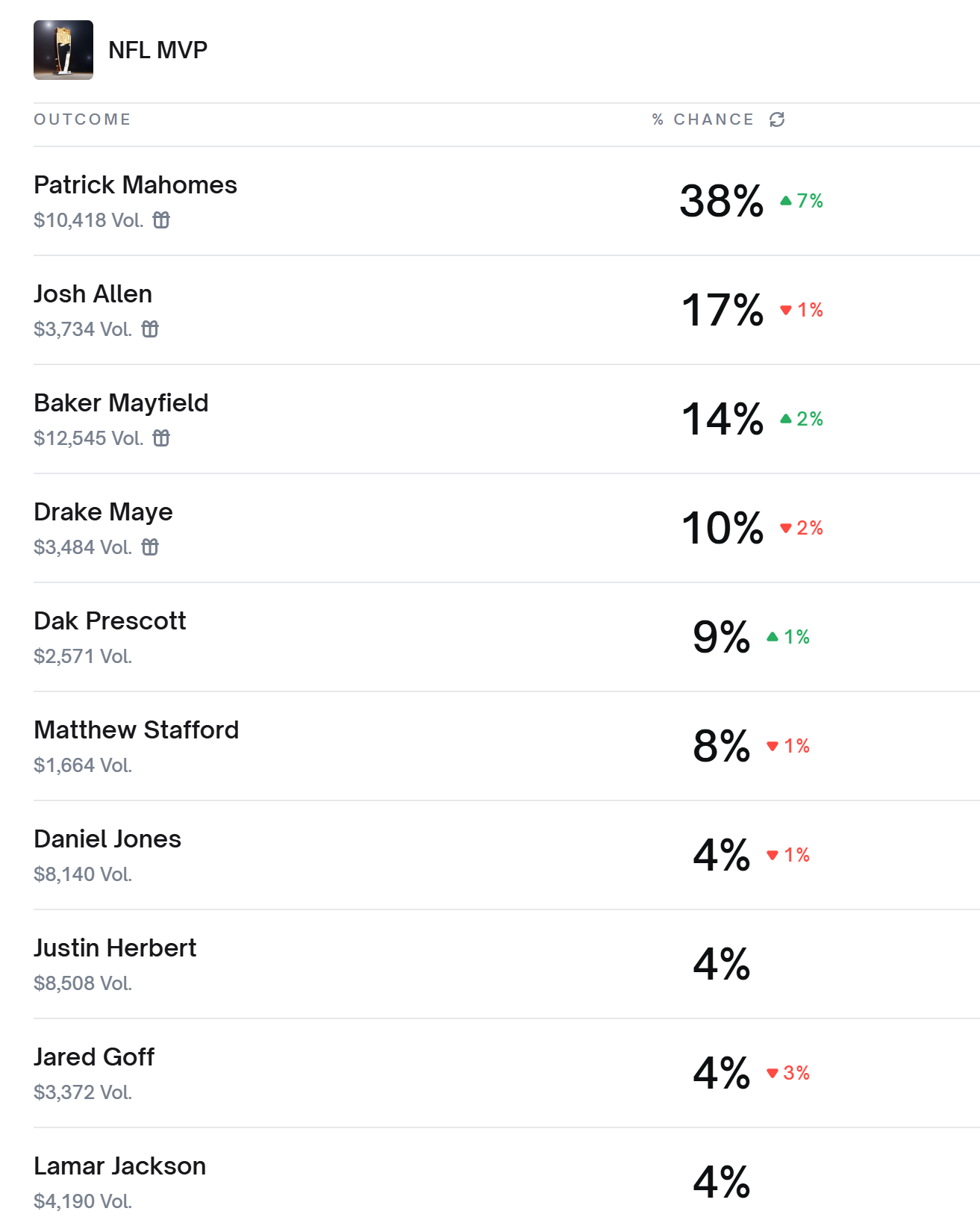 And yet, here Prescott is again in 2025, playing some of the best football of his career — lifting a defensively-challenged Dallas team into shootouts what feels like every week and doing his best to keep the Cowboys in the playoff picture. Dak currently ranks second in my EPA value over replacement stat, trailing only Patrick Mahomes among QBs, and he sits fifth in Polymarket’s NFL MVP odds with a 9 percent chance to win the award: