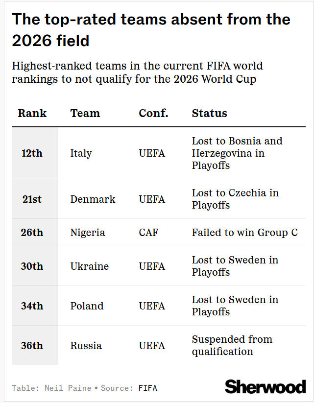 At No. 12 in the current FIFA rankings, Italy is the highest-rated national team to miss the 2026 World Cup field, followed by Nos. 21 Denmark and 26 Nigeria: