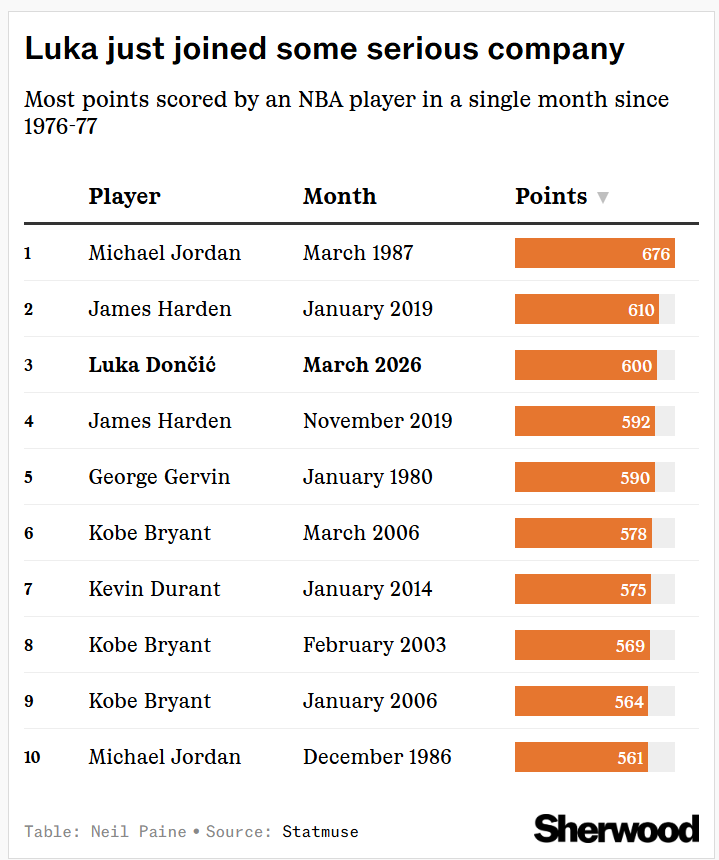 The Los Angeles Lakers are on a real hot streak right now — no team has added more to its Elo power rating over the past 15 days, and only the Wembanyama-powered Spurs have added more over the past month. Helping to fuel LA’s 15-2 record in March: the insane scoring tear of Luka Dončić, who averaged 37.5 points per game (to go with 8.0 rebounds and 7.4 assists) in the month. Along the way, he became only the third NBA player since the 1976 ABA merger to tally 600 points in a single month, joining Michael Jordan in March 1987 and James Harden in January 2019: