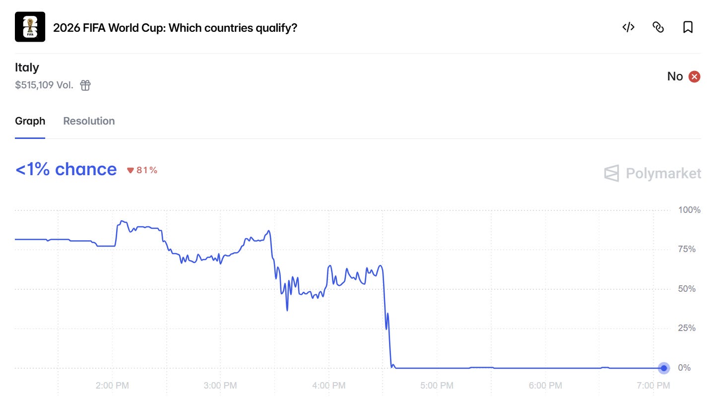 Still, 2026 was supposed to be the year the Azzurri returned. And the prediction markets were fairly confident throughout the past week, sitting at 82% going into Italy’s Tuesday match and peaking at 94% when Moise Kean scored 15 minutes in. But a red card midgame left Italy shorthanded, the Bosnians notched the equalizer in the 79th minute, and the game went into penalties — where Italian shooters Pio Esposito and Bryan Cristante missed, and Wisconsin-born winger Esmir Bajraktarević eliminated Italy with a make.
