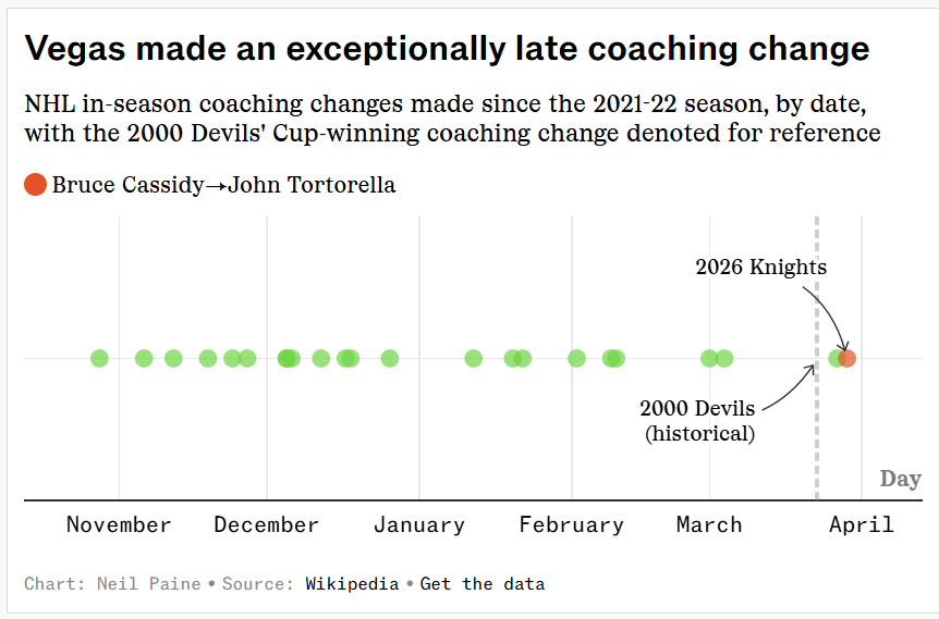 Normally, NHL teams don’t fire their coaches as the calendar is about to flip to April. It’s late enough in the season that playoff-bound teams usually roll with what they’ve got — bringing in a new coach would be a massive source of upheaval — and non-playoff squads will wait until the offseason to make a change. But the Vegas Golden Knights don’t tend to follow convention, which means they fired Stanley Cup-winning coach Bruce Cassidy on Sunday in favor of firebrand John Tortorella with just weeks to go in the regular season. The logic of the move was that Vegas is a win-now team mired in a slump, in need of a new voice, and they won Tort’s debut on Monday night to bring their playoff odds to 90%. But that doesn’t make the timing of the move any less unprecedented relative to recent years: