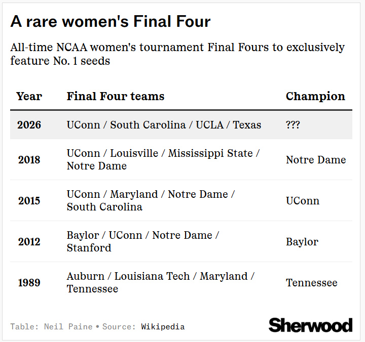 As mentioned above, a Final Four of UConn, Texas, South Carolina, and UCLA represents pure chalk: a quartet of No. 1 seeds sweeping the regions along the road to the national semifinals. And despite the women’s tournament’s reputation for imbalance between the top teams and everybody else in general, this type of sweep is still very rare. Including 2026, it’s happened only five times in history — and previously not since 2018: