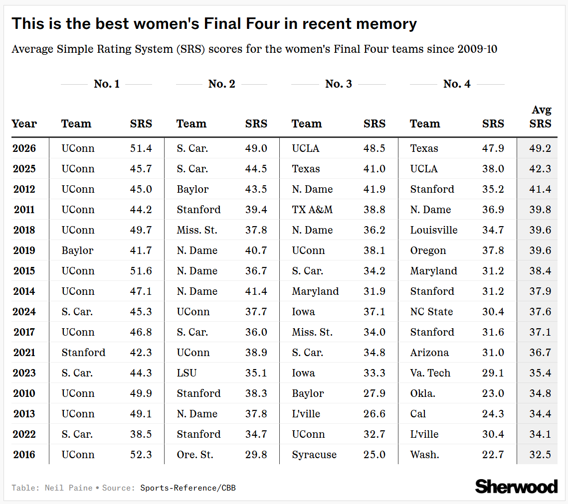 Want more chalky goodness? By Sports-Reference’s Simple Rating System, this is only the second time since 2010 (joining 2012) that the nation’s four highest-rated teams were also the Final Four — and the average SRS rating across UConn, South Carolina, UCLA, and Texas (49.2) is by far the highest for any women’s Final Four in that span: