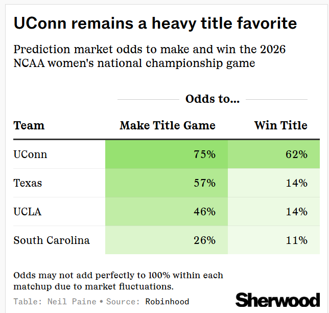 So at the expense of upsets, close games, and unexpected outcomes earlier in the tournament, we do get repaid with probably the most stacked Final Four in the history of the women’s tourney. But will that lead to great basketball now? Well, Texas-UCLA is projected to be fairly close, with the Longhorns holding a 57% edge in the prediction markets. But Connecticut remains a sizable favorite, both to beat South Carolina (75%) and to eventually win the title game (62%):