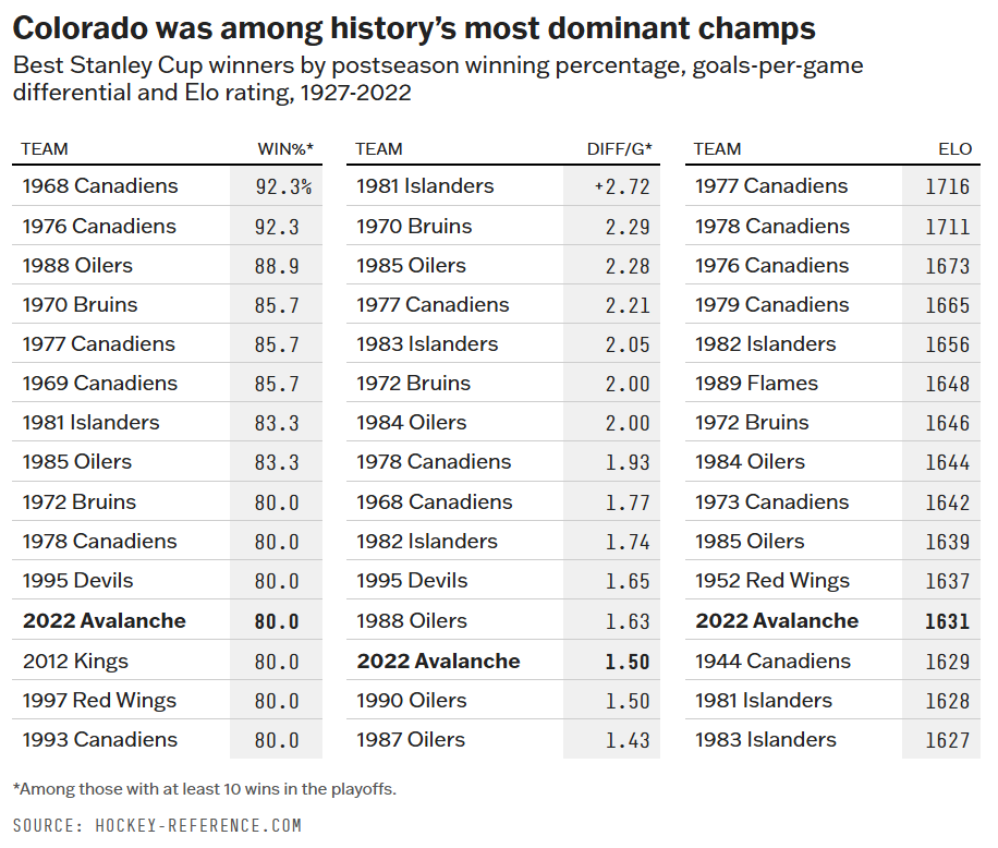 Colorado’s performance this postseason was dominant. The Avs finished the playoffs with a 16-4 record, a goals-per-game differential of plus-1.5 and an Elo rating of 1631, all of which rank among the best dozen or so among Stanley Cup winners in modern NHL history:1