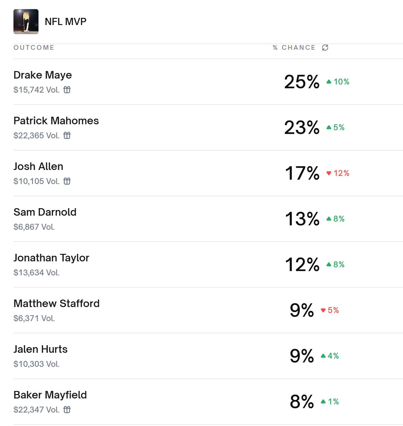 If the New England Patriots aren’t fully “back” yet, well, it’s sure starting to feel like they are. After beating the Tampa Bay Buccaneers 28-23 on the road Sunday, the Pats have now won seven straight games — bringing their record on the season to 8-2, tied for tops in the league. And at Polymarket on Sunday afternoon, QB Drake Maye had moved ahead of the resurgent Patrick Mahomes and an inconsistent Josh Allen to take the lead as MVP favorite in this odd NFL season: