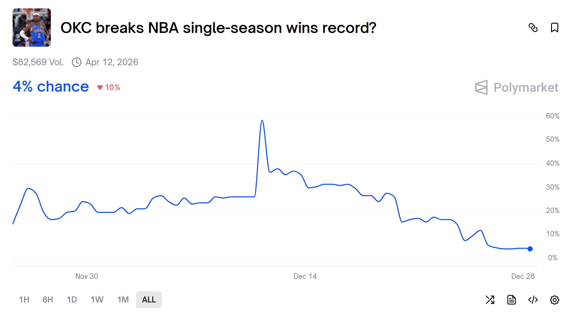 However, that all changed in the NBA Cup semifinals, when Victor Wembanyama and the San Antonio Spurs overcame a 16-point first-half deficit to upset OKC en route to the Cup final. Then, after OKC suffered another loss to Minnesota on Dec. 19, San Antonio routed the Thunder by 20 at home on the 23rd — and followed it up with a 15-point win in a nationally-televised Christmas Day rematch in Oklahoma City. In the span of just 12 days, those losses all but completely knocked OKC off track to break the ‘16 Warriors’ NBA record for most wins in a single season, according to the prediction-market odds (per Polymarket):