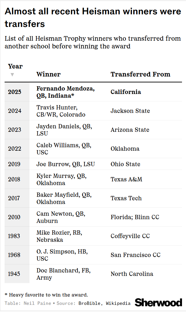 The other, even bigger trend in college football is toward transfers — with the advent of the transfer portal and the abolition of rules that used to force players to sit out and lose a year of eligibility if they transferred, both changes coming in the past decade. As a result, the vast majority of all Heisman winners who transferred before winning the award have come since 2017. And if Mendoza (who played two seasons at Cal before moving to IU) does win, it would mean transfers have won the award in each of the past four years — and seven of the past nine.
