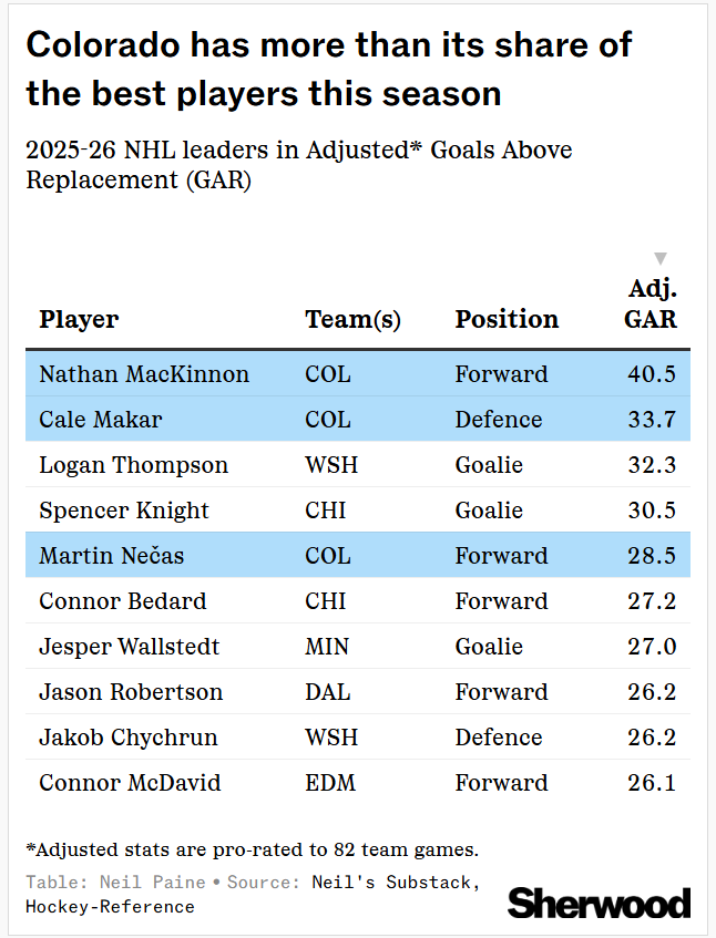 The Colorado Avalanche are tearing up the NHL this season — and, as I wrote this week, a lot of that is due to the trio of Nathan MacKinnon, Cale Makar, and Martin Nečas, each of whom is tracking among the league’s top 5 players by adjusted Goals Above Replacement. MacKinnon is on pace for one of the greatest non-goalie seasons in NHL history, Makar is flirting with a peak that rivals Bobby Orr’s best years, and Nečas has unexpectedly vaulted into superstar territory after arriving from Carolina via trade last year. At their current rates, the three could combine for the most GAR ever by a trio of teammate skaters in a single season.