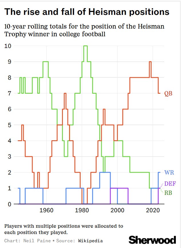 Running backs had their heyday in the 1970s and early ’80s, peaking with a greater stronghold on the trophy than even QBs have at their peak. But that was a long time ago, and no RB has won the award since Alabama’s Derrick Henry in 2015. The trend is toward passing, as reflected by three of this year’s finalists being QBs (Mendoza, Pavia, Sayin) versus just one RB (Love).