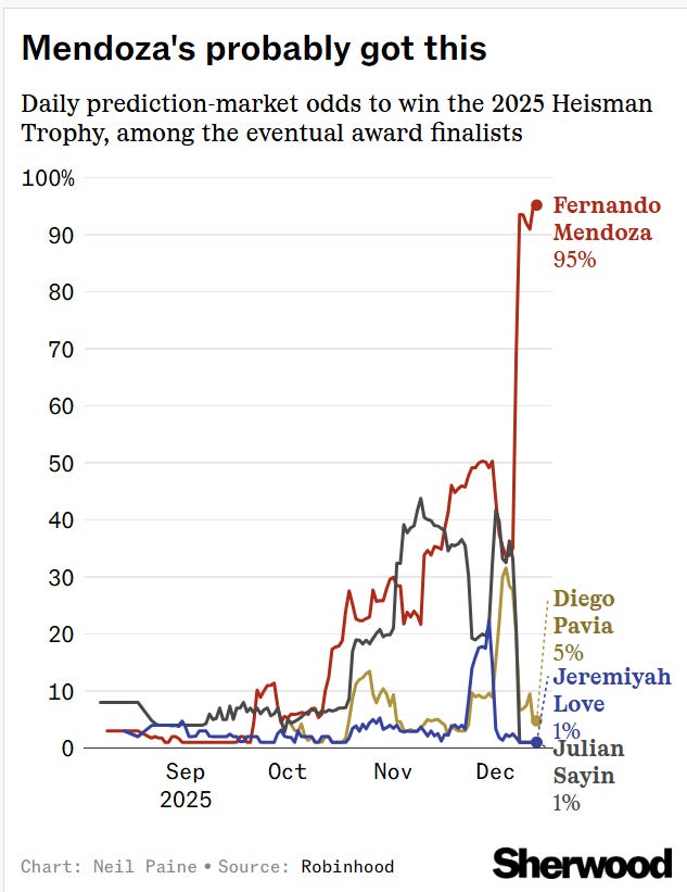 We had a bit more uncertainty in the prediction market odds this season than we did a year ago, when eventual winner Travis Hunter was a massive favorite to win by mid-November. The four finalists in 2025 — Fernando Mendoza (Indiana), Diego Pavia (Vanderbilt), Julian Sayin (Ohio State), and Jeremiyah Love (Notre Dame) — were jumbled nearly evenly at the end of last month, and Mendoza, Sayin, and Pavia were still all very much in the mix together as recently as conference championship weekend. Only with Indiana’s victory over Ohio State in the Big Ten title game did Mendoza appear to separate himself, rising to his current level of 95% in the odds: