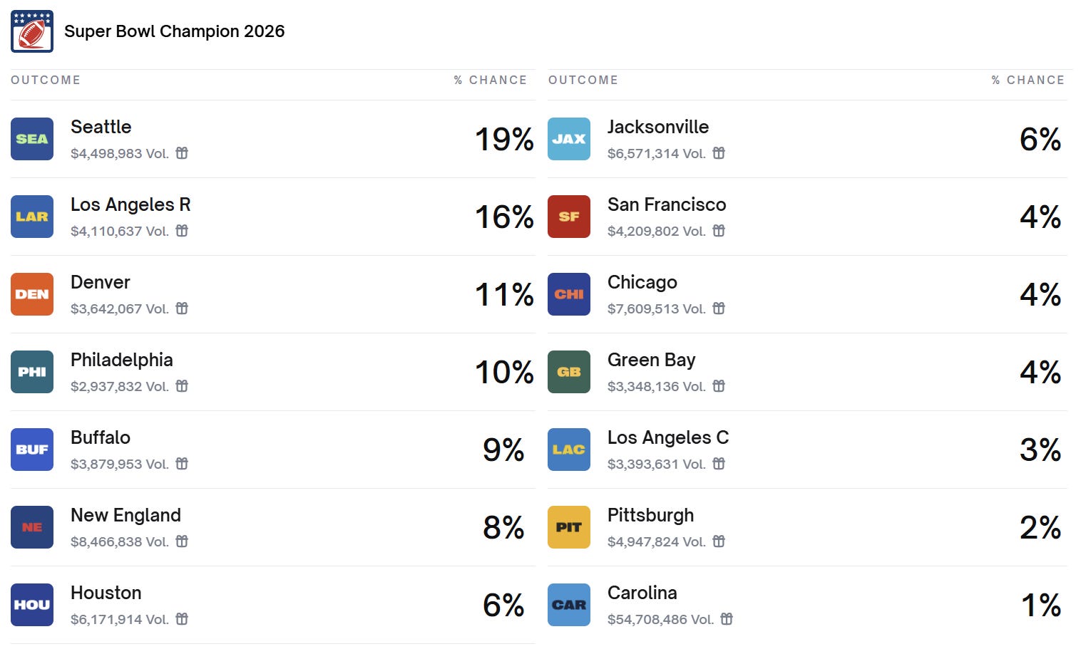 But Seattle has been building its case steadily over the weeks and months, winning seven straight games — and 11 of 12 — with the league’s best PPG differential and no loss by any more than four points.1 By peaking at the right time in ratings that reward more recent form, while their rivals have looked less reliable, the Seahawks’ dominance makes them the best team on paper ahead of the playoffs.That’s not quite as clear in other measures, though. Seattle is also the Super Bowl favorite in the betting odds and the prediction markets. Here are Polymarket’s championship probabilities, for instance: